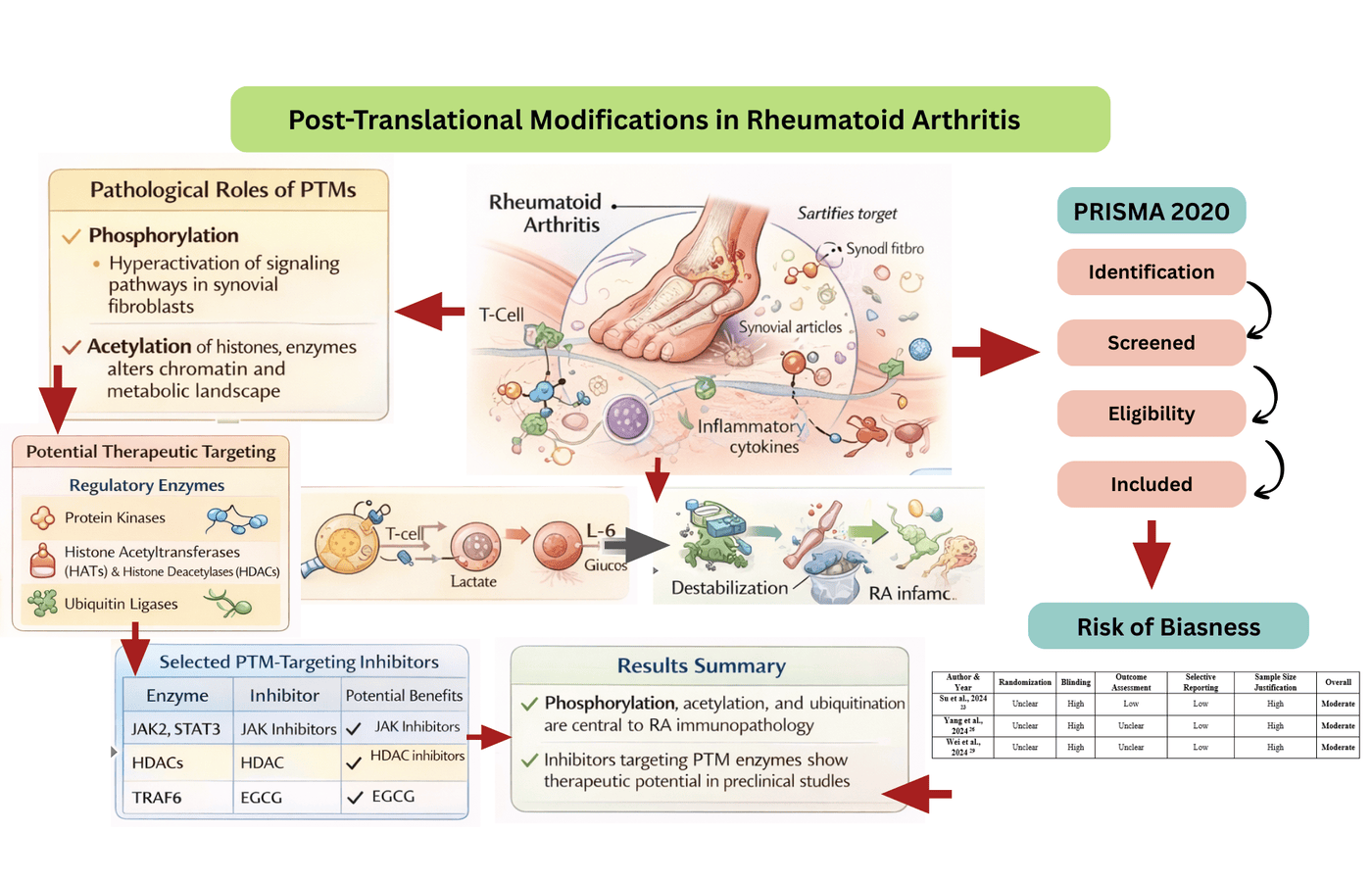 Background: Post-translational modifications (PTMs) such as phosphorylation, acetylation, and ubiquitination played a critical role in pathogenesis of inflammatory diseases including rheumatoid arthritis (RA). This systematic review aimed to synthesize evidence of principal role of PTMs in RA and to evaluate the therapeutic potential of agents targeting these dysregulated modification pathways. Methods: This systematic review followed PRISMA guidelines 2020. Research was conducted in PubMed, Scopus, Web of Science, and Google Scholar from 2015 to 2025. The studies which explored the role of particular PTMs in the RA pathophysiology and their therapeutic potential, were considered. Articles and reviews that were not written in English and where mechanistic or therapeutic outcomes were not described were excluded. The JBI Critical Appraisal Checklist, Newcastle-Ottawa Scale, and SYRCLE tool were used for evaluating risk of bias whereas, quality of study was evaluated using GRADE approach. Results: The findings of twelve studies demonstrated that dysregulation of PTMs played a substantial role in RA immunopathology. Mechanistically, acetylation, ubiquitination, and phosphorylation are involved in dysregulated T-cell metabolism, Th17/ Treg imbalance, synovial fibroblast activation, and pro-inflammatory signaling. Preclinical studies supported the therapeutic potential of targeting associated regulatory enzymes. The risk of bias of most studies was measured as moderate and certainty of evidence was found to be low. Conclusion: Phosphorylation, ubiquitination, and acetylation played a critical role in the pathogenesis of RA and could be exploited as potential therapeutic targets.
