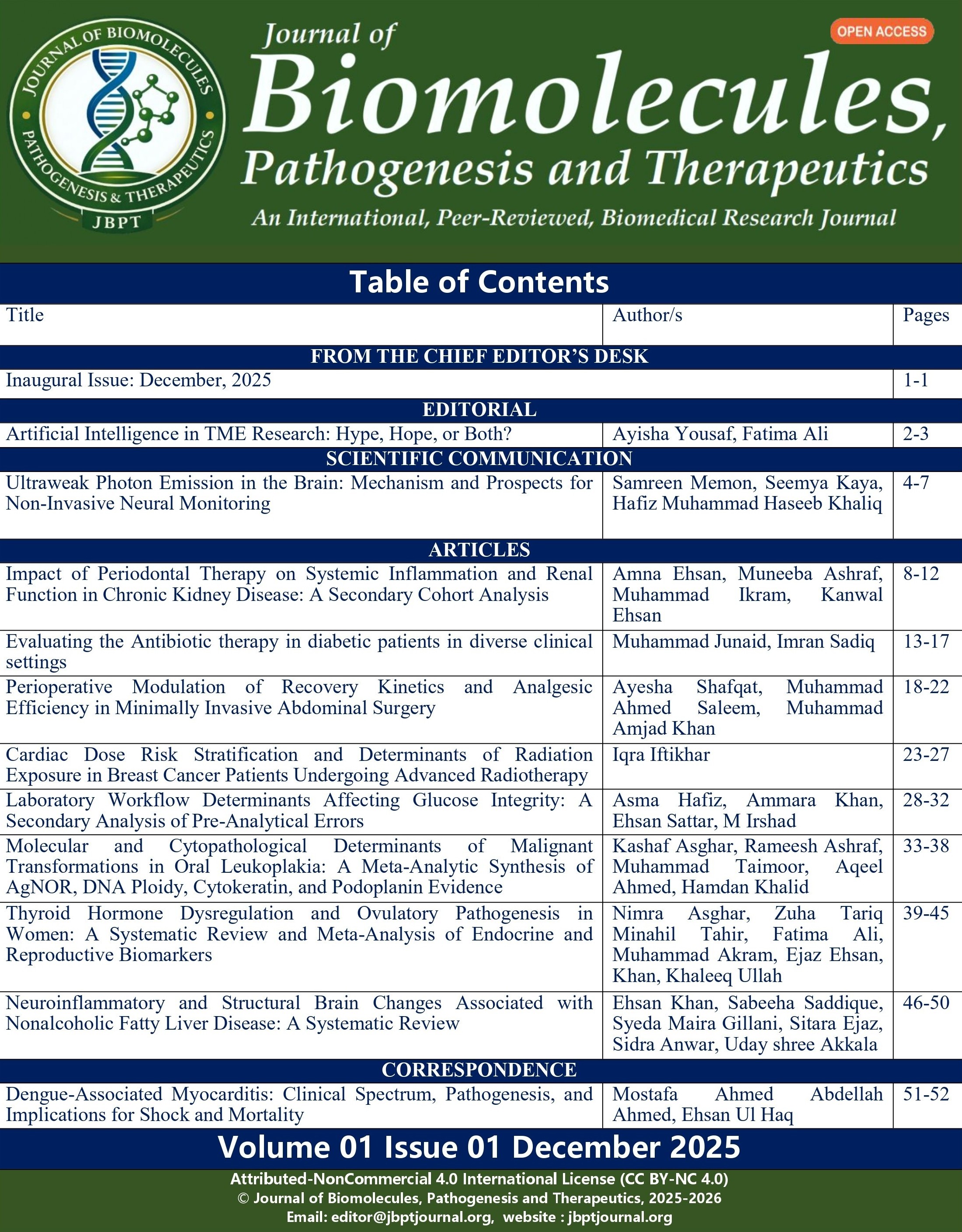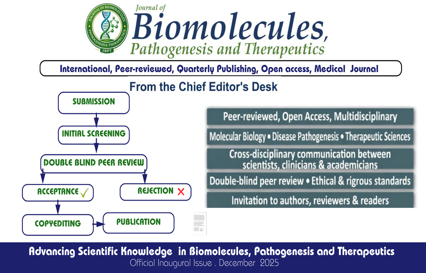 This inaugural issue marks the official launch of the Journal of Biomolecules, Pathogenesis and Therapeutics (JBPT)